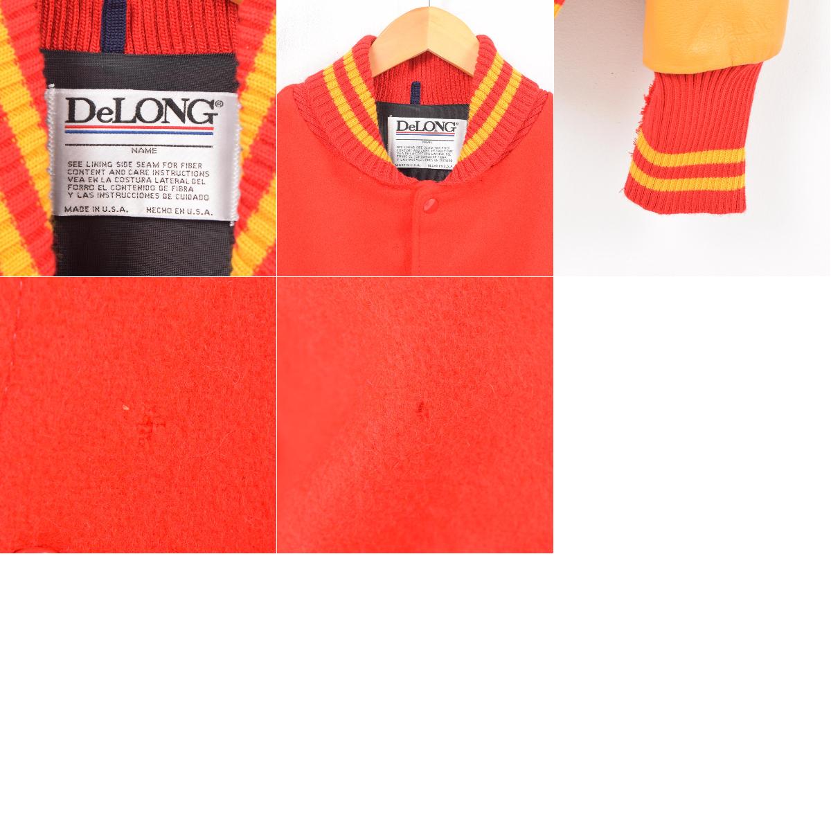 商品詳細ブランド・DeLONG ・ デロング・特徴・スナップボタン・ヴィンテージ・アメカジ・モデル/形状・袖革ウールスタジャン アワードジャケット・素材・ウール:80%・UNKNOWN FIBERS:20%・色・レッド系 赤色・オーカー系 黄土色・柄生産国・USA製・年代・90年代・サイズ・メンズXL・表記サイズ:L/Gde・着丈:70.5cm・身幅:65cm・肩幅:57.5cm・袖丈:68.5cm・コンディション・C・カテゴリ・メンズ・ジャケット・スタジャン・アウター・商品番号・waw1314・取扱店・桃谷店・スタッフコメントDeLONG 袖革ウールスタジャン アワードジャケット / メンズXL / 商品番号 waw1314※写真の両面の箇所にダメージがあります。